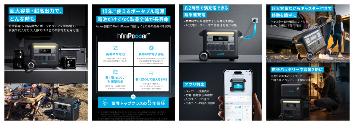 アンカー、史上最大容量・最高出力の長寿命ポータブル電源を予約販売。同容量の拡張バッテリーと高出力ソーラーパネルも(13/31)
