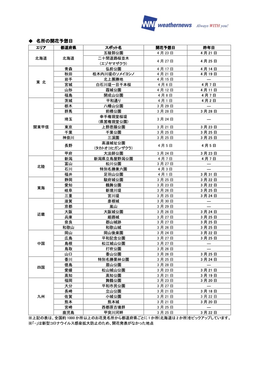 ウェザーニューズ、第二回桜開花予想。最速開花は東京3月21日。西~東日本は平年並~やや早く、北日本も平年より早め