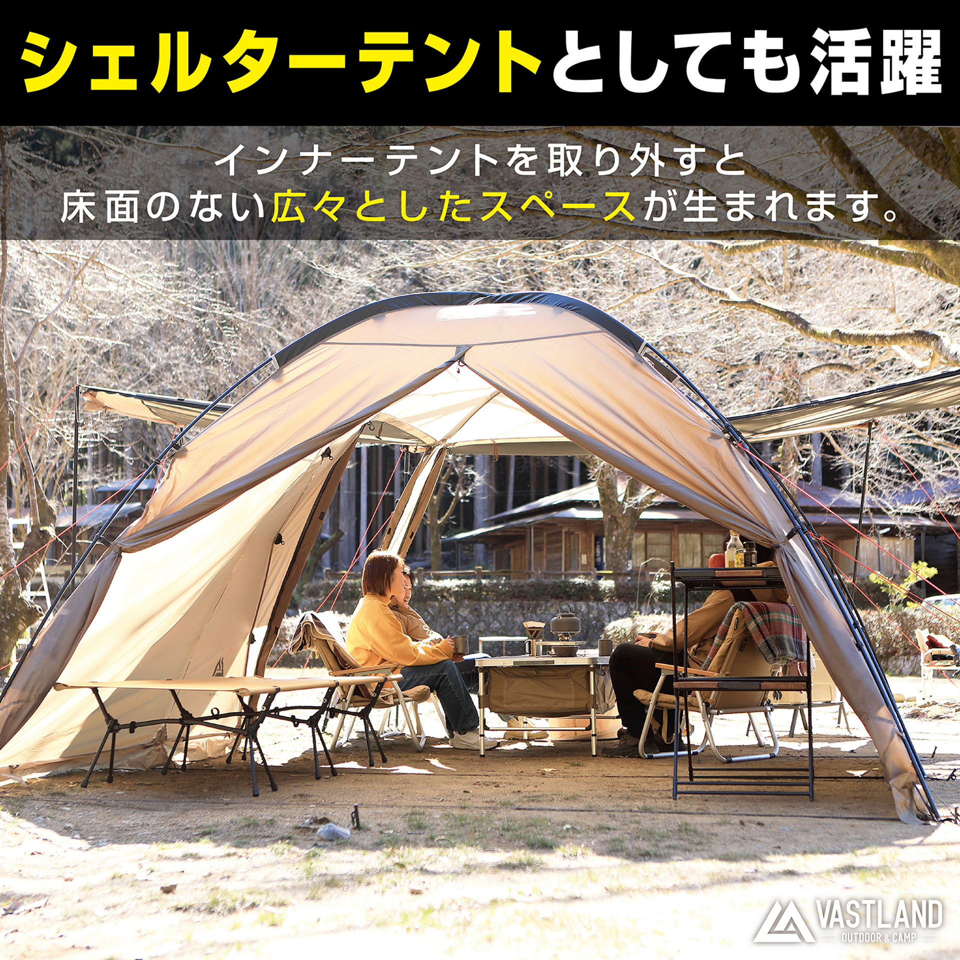 VASTLAND、シェルターテントになる「2ルームドームテント」。ペグダウンなしで自立、設営後も移動できる(7/17)
