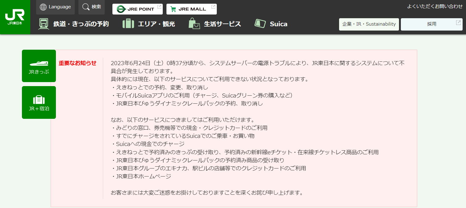 JR東日本、サーバーの電源障害でえきねっとやモバイルSuicaの一部が利用できず