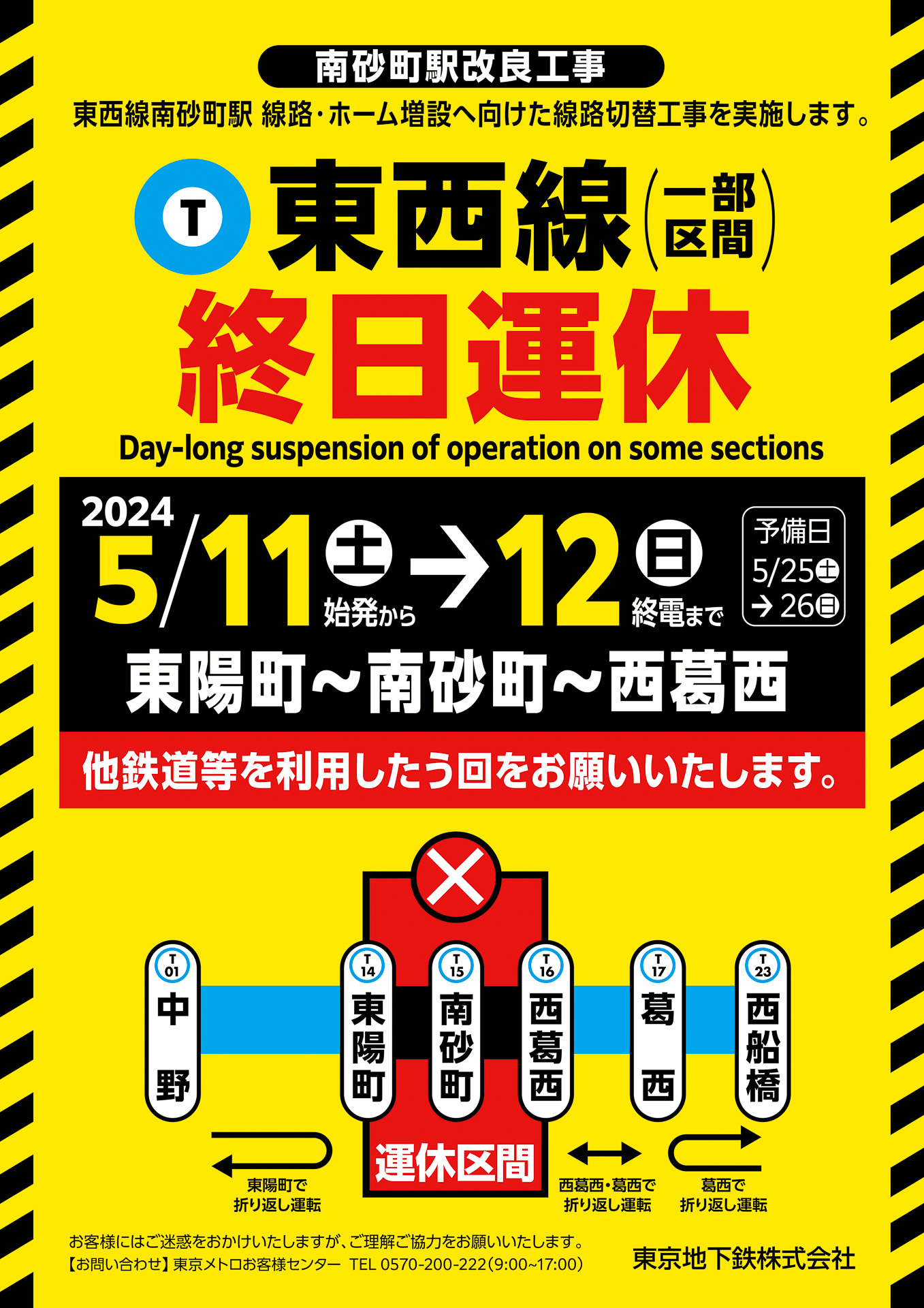 東西線 東陽町~西葛西で5月11日~12日に終日運休。西葛西~葛西は折り返しで15分間隔に