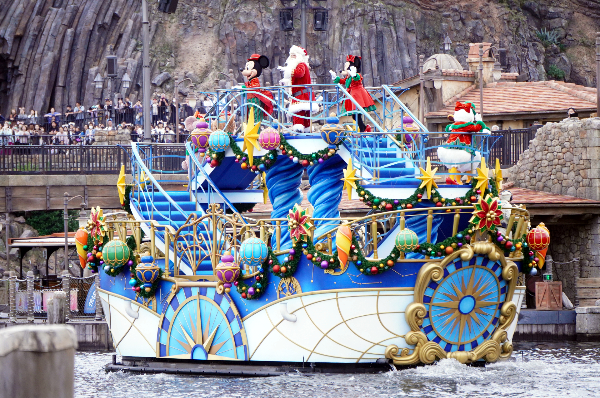 クリスマス衣装のミッキーと仲間たちが東京ディズニーシーの水上グリーティングに登場! 楽しい振付け&音楽でサンタもノリノリ(7/18)