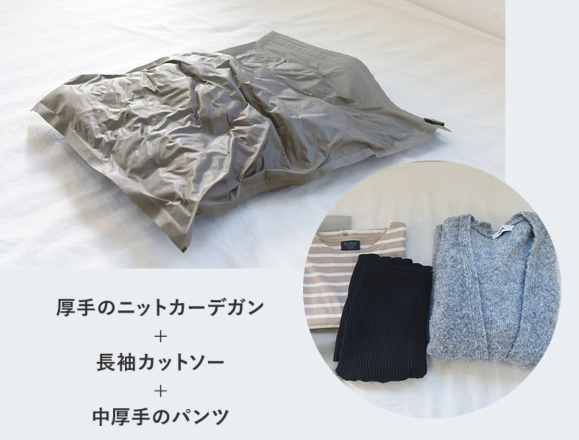 パッキングを時短! 排気バルブ付き「丈夫な衣類圧縮袋 2枚セット」。布地みたいな素材で繰り返し使える(6/11)