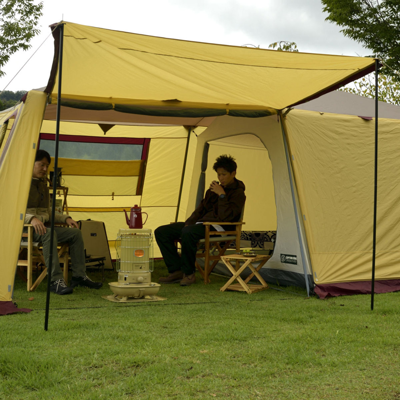 テンマクデザイン、薪ストーブ用テント「サーカスTC+ チムニーウォール」。煙突穴をクリア窓にすれば1年中使える