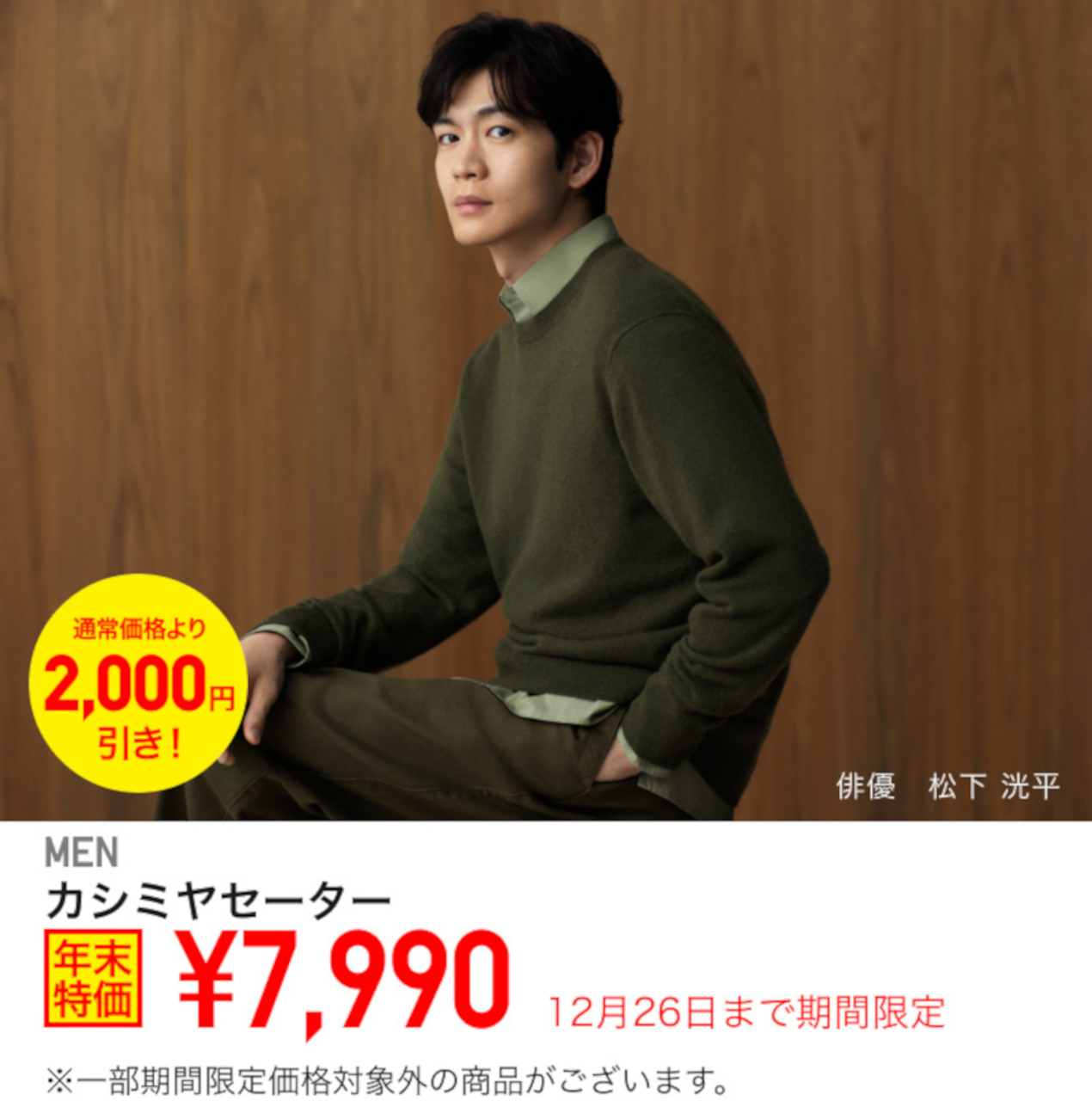ユニクロ、「年末祭」今日から31日まで。カシミヤ&高機能ダウンが特価2000円引き(6/10)