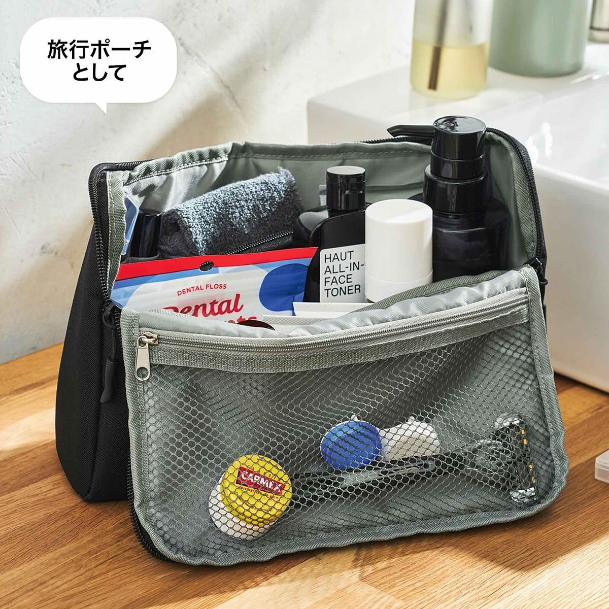 ファミマ限定「DOD」多機能ボディバッグ、ガバッと開いて中身が見やすく収納力あり。ベージュ/ブラック