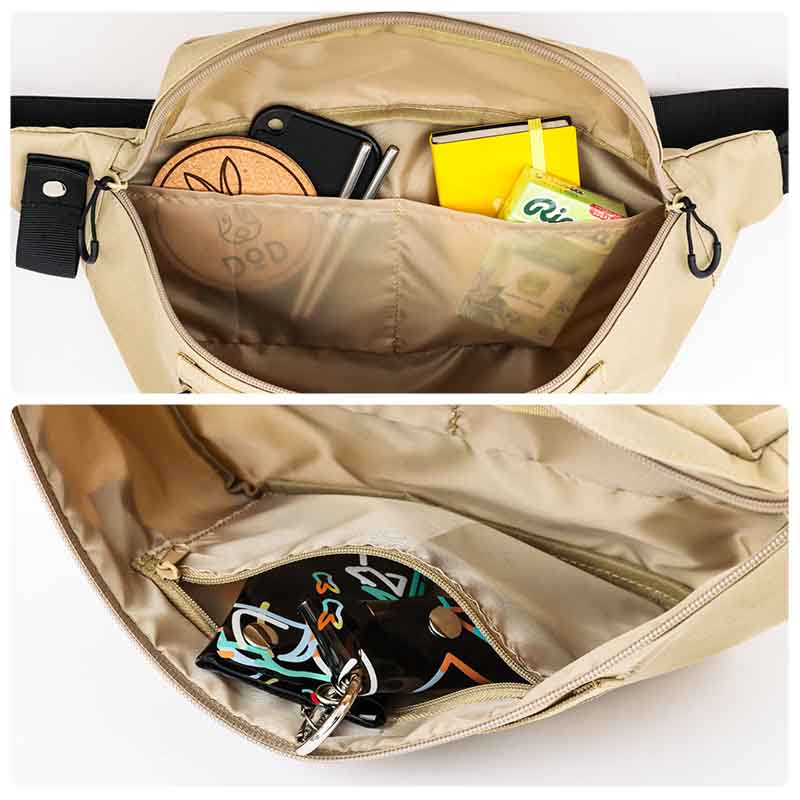 ファミマ限定「DOD」多機能ボディバッグ、ガバッと開いて中身が見やすく収納力あり。ベージュ/ブラック(7/17)