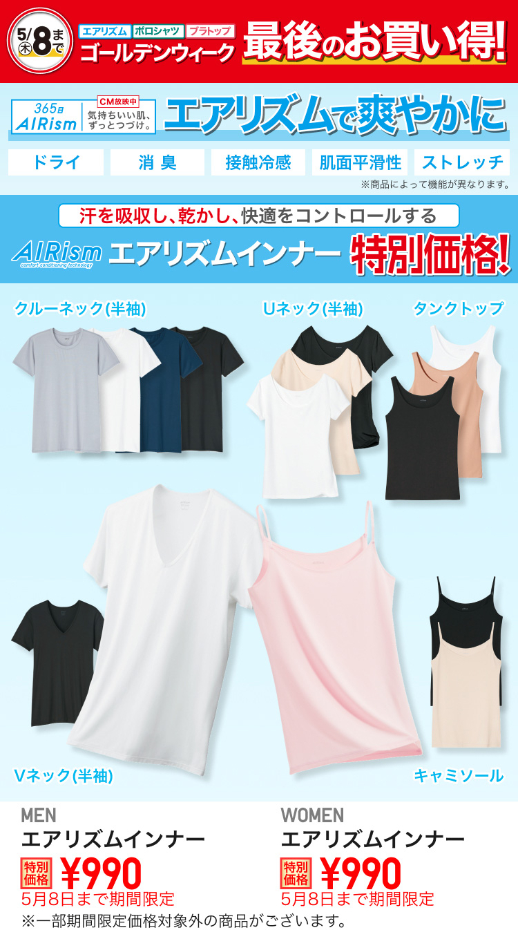 ユニクロ、GWセール号外。3日間限定でエアリズムコットンT/ウルトラストレッチパンツ/ラウンドミニショルなど値下げ