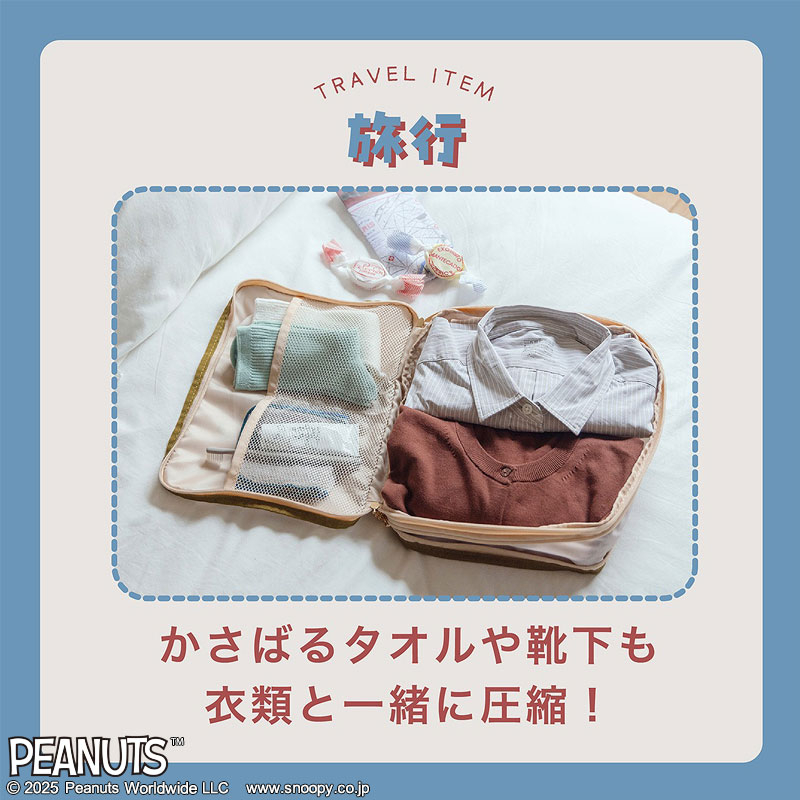 宝島社、衣類がかさばらないスヌーピーの圧縮収納ポーチ。ファスナーをとじてスリムに(4/7)