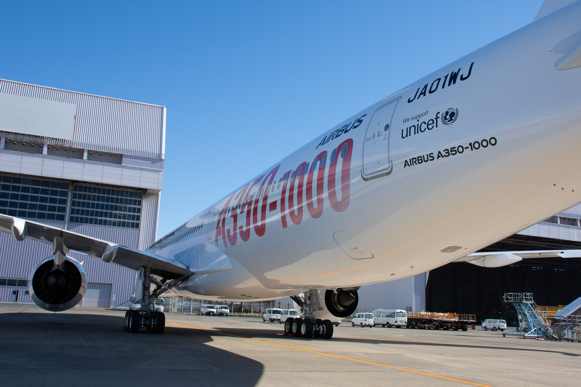 JALの新型機A350-1000、初号機に赤いロゴ施す