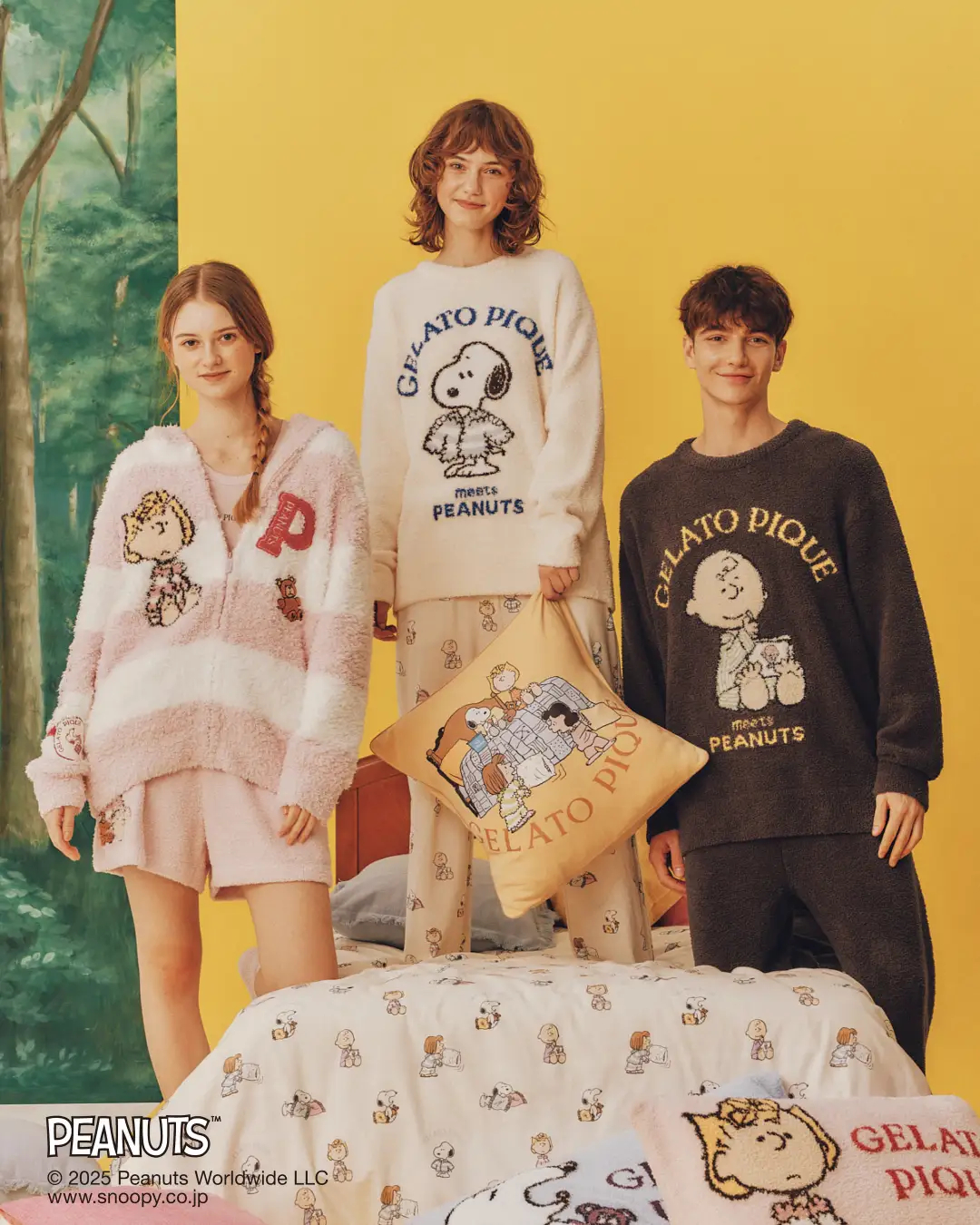 「GELATO PIQUE meets PEANUTS」11月発売。スヌーピーたちのルームウェア姿を描いたアイテム、寝具やバッグ類も(2/18)