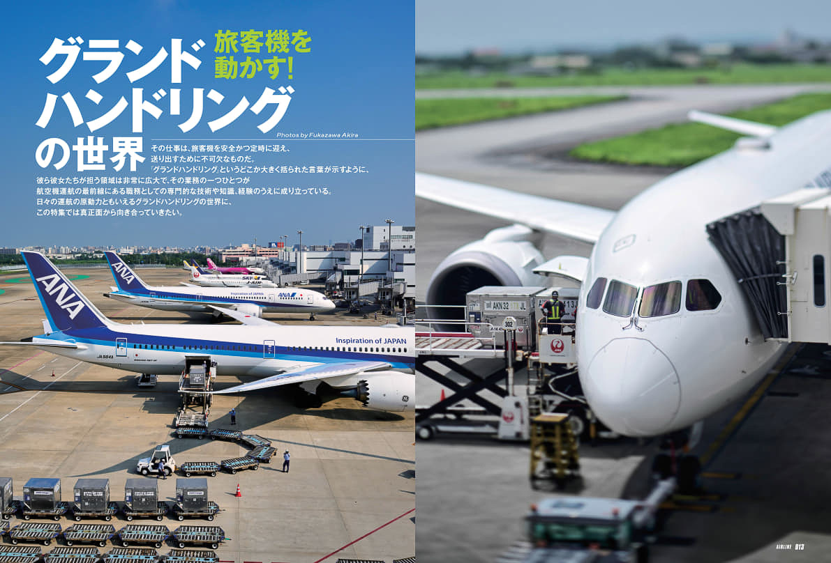 月刊エアライン 2026年1月号、特集は「グランドハンドリングの世界」。航空写真家・深澤明によるカレンダー付き(3/9)