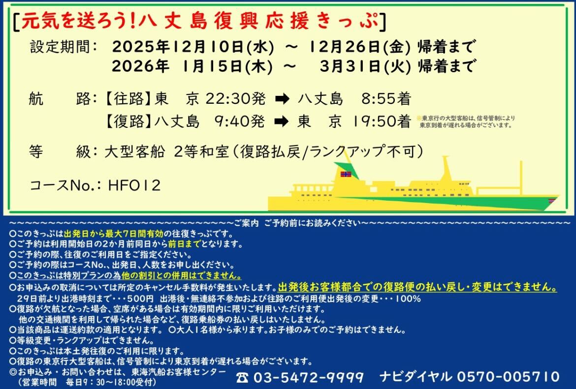 東海汽船、往復1万2000円で行ける「八丈島復興応援きっぷ」を5月末まで販売延長